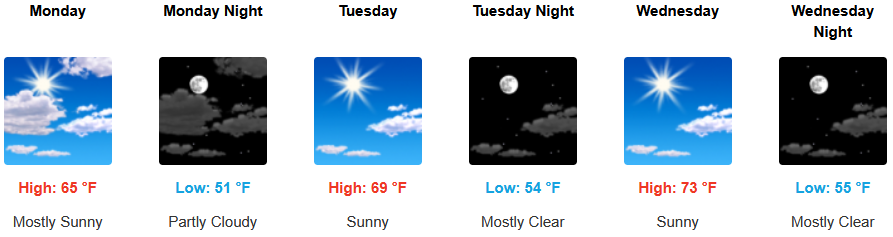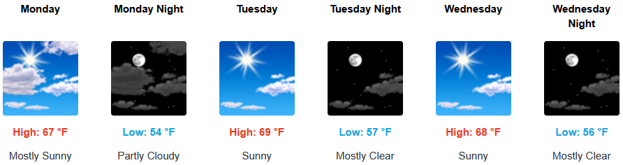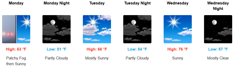 Coastal regions will see a continued morning marine layer along the immediate coast and localized areas of morning fog under partly cloudy to mostly skies. High temperatures are expected to gradually warm to the low to mid 70’s as the work week continues with overnight lows in the low to mid 50’s.