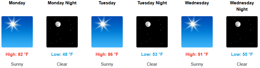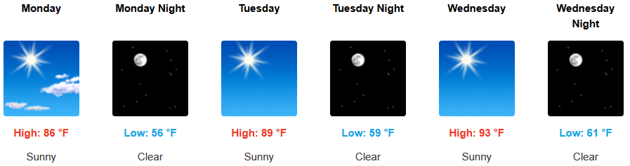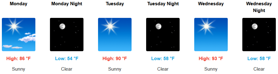 Inland areas, are forecast to see mostly sunny skies and temperature warming as the week progresses, however, remaining below average into midweek, as high temperatures build from the low to mid 80’s to the mid to upper 90’s by midweek with lows in the upper 50’s.