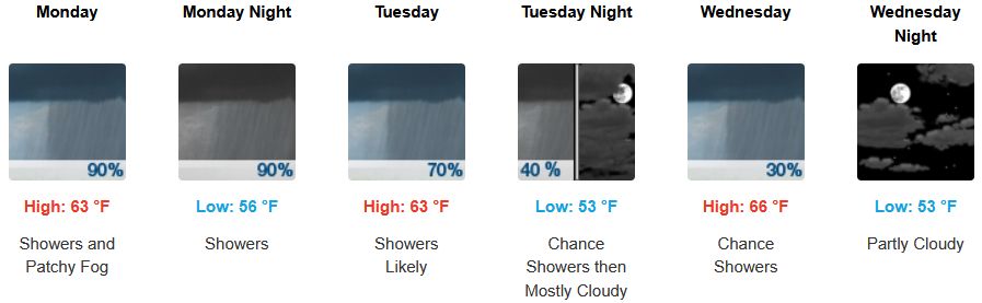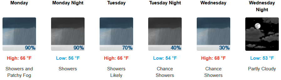 Along the coast, showers could begin to move onshore as early as late Sunday evening continuing into midweek with the marine layer continuing along the immediate coast. Temperatures are expected to stay in the low 60’s for highs in most areas with morning lows in the low 50’s.