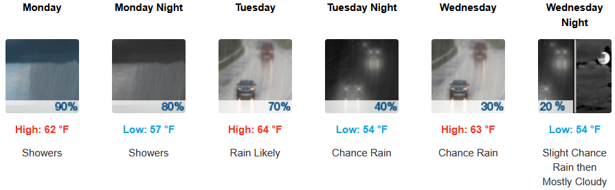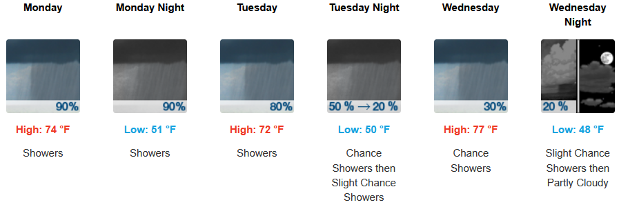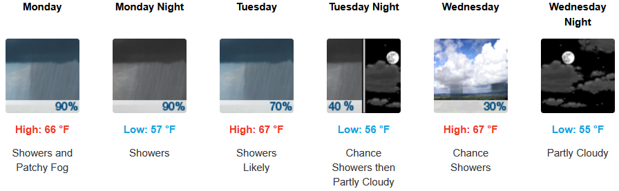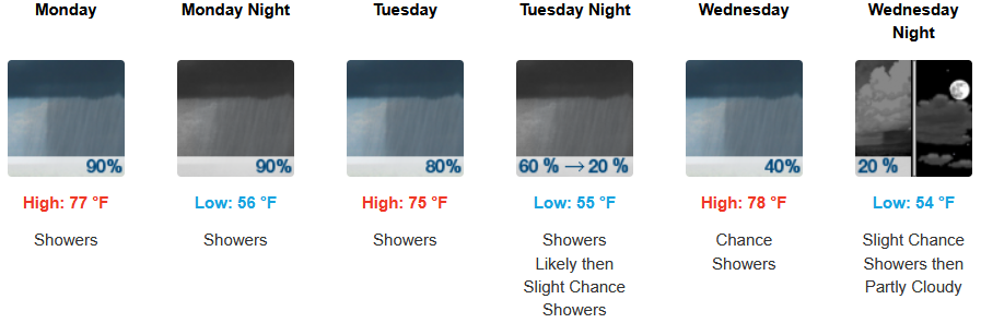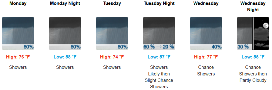 Inland areas can expect much cooler temperatures, showers, with thunderstorms possible beginning Monday and continuing through midweek. Afternoon highs are expected to fall to the mid to high 70’s across the region, with lows forecast to be in the low 50’s.
