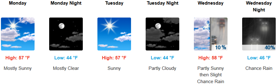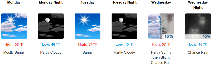 Along the coast, mostly sunny skies prevail into midweek with chances of a morning marine layer along the immediate coast before a slight chance of rain begins late Wednesday. Temperatures are forecast to be in the upper 50’s for highs, with morning lows in the low to mid 40’s.