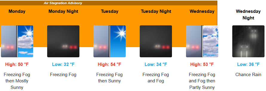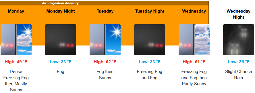Inland areas can expect to see mostly sunny skies to start the work week with low temperatures near freezing in some areas bringing widespread freezing fog before another round of precipitation begins late Wednesday. Afternoon highs in the upper 40’s to low 50’s, with lows forecast to be in the upper 20’s to low 30’s.