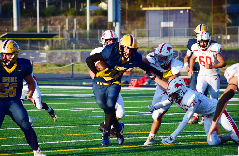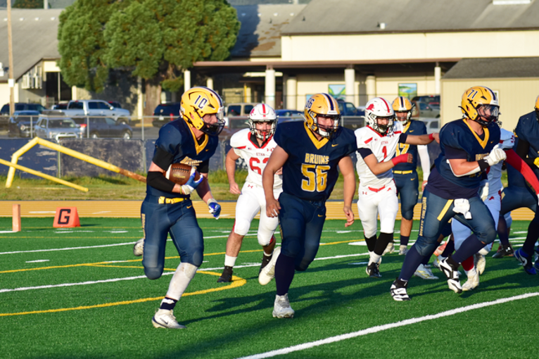 Picking up where they left off after the first offensive attack, the Bruins would sweep junior running back, #10, Owen Austin, around the right for a big pick up followed by a deep pass deep would put the Bruins in position to score again. Austin would again find the edge for a touchdown run from just inside the twenty.