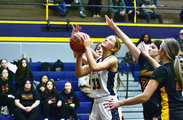 The Bruin girls immediately came out running, scoring off the opening tip and then settled into a high energy press on the Lady Knights inbound play to slow North Valley early. But the Lady Knights worked their way through the pressure, staying with the Bruin girls who led 9-6 midway through the first, before ending the first with a 14-12 lead.