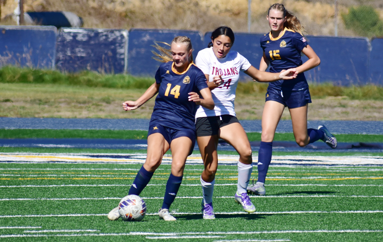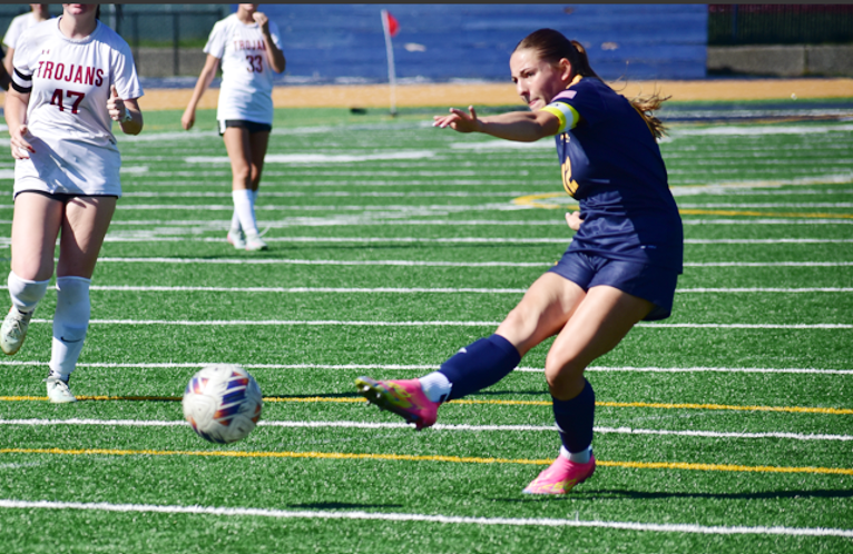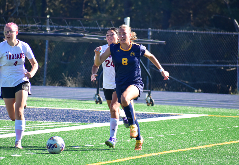 The pressure in front of the goal would then cost the Douglas defense once more within minutes after the Bruin girls again pushed a cross in front of the Lady Trojans goal that force the defense into an own goal after sophomore forward Claire Pieper, #3 attacked the crossing ball forcing the defender to block Pieper’s attack, defensively forcing the ball into their own net.