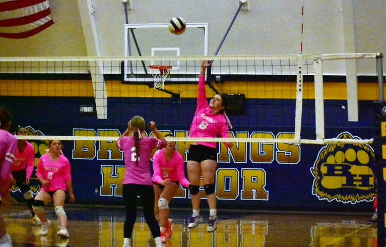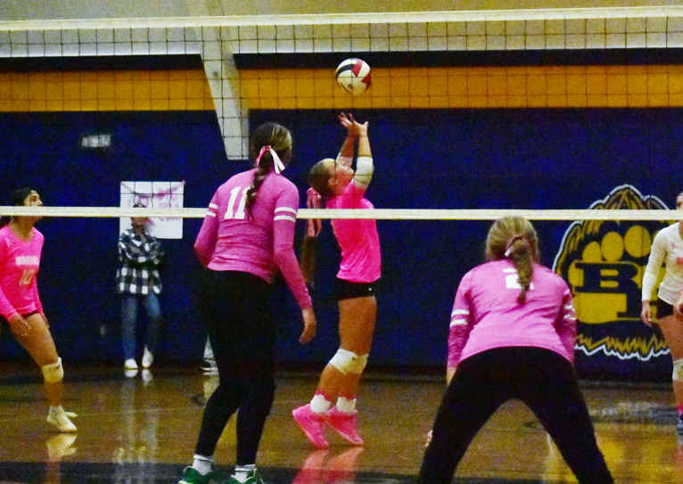 Head coach, Vanessa Nidiffer, and the Bruin girls varsity volleyball team recognized Breast Cancer Awareness Month Thursday evening, hosting the Rogue River Lady Chieftains.
