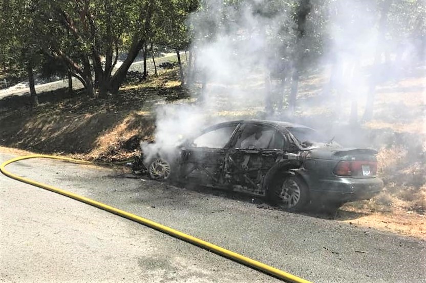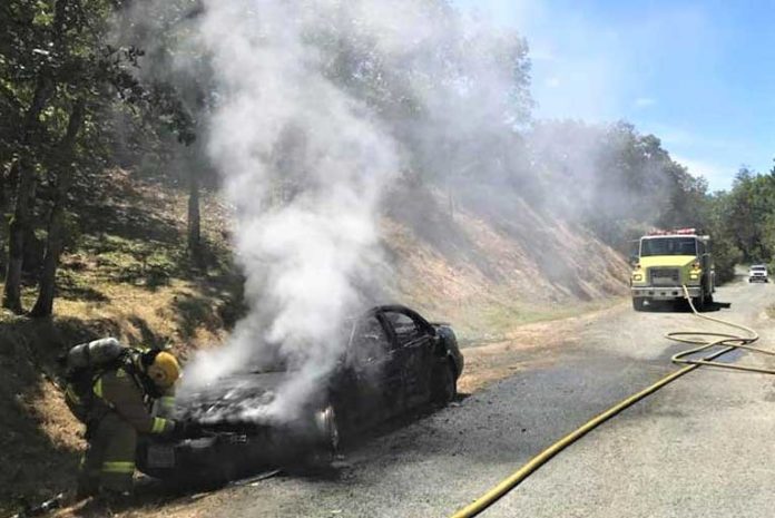A suspected mechanical problem led to a fully involved motor vehicle. At the time of the 911 call, the fire was reportedly spreading fast into the surrounding grass, possibly threatening nearby homes.