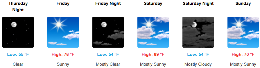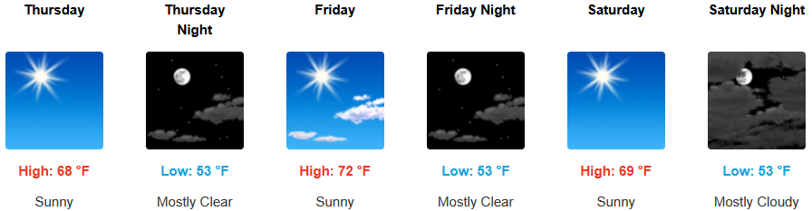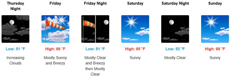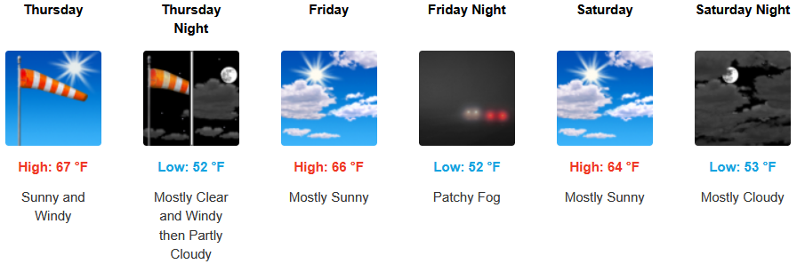 Along the coast, sunny skies and warm afternoon temperatures are forecast to continue to close out the work week. A north northwest wind is expected along the coast with gusts reaching up 20mph. Afternoon highs are expected to reach the mid to upper 70’s, with morning lows cooling to the low 50’s.