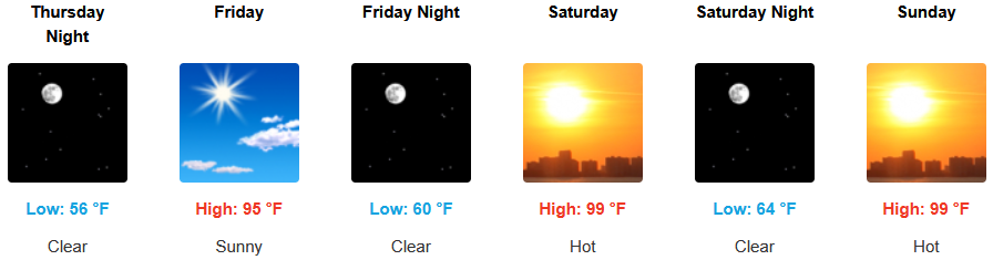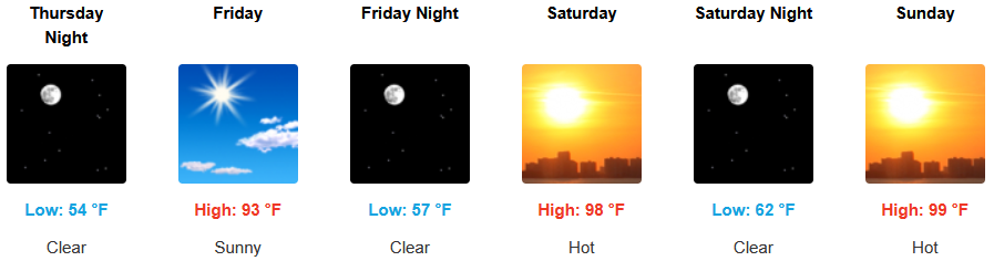 Inland areas are forecast to see continued sunny skies into midweek with afternoon highs increasing into and through the weekend. Afternoon highs are expected to be above normal reaching the upper 90’s and possibly triple digits in some locations and morning lows in the low to mid 50’s.