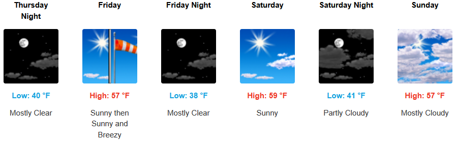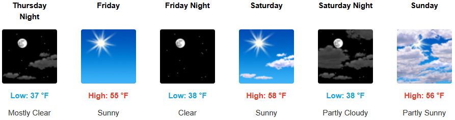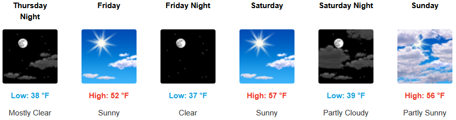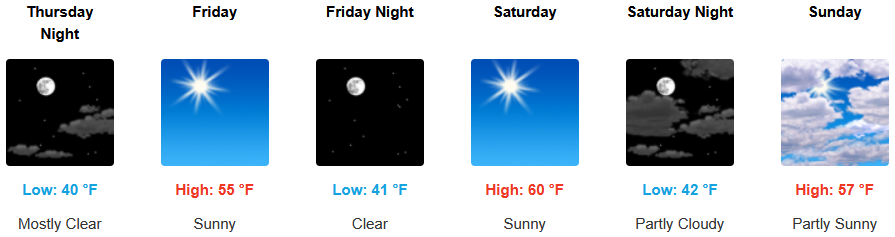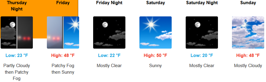 Inland areas are forecast to see mostly sunny skies going into the weekend as weather systems continue to impact areas to the north. The National Weather Service has issued dense freezing fog warnings through Thursday with afternoon highs expected to be in the low 40’s, with lows forecast to be in the upper 20’s to low 30’s.