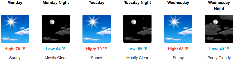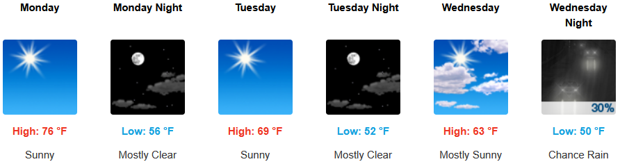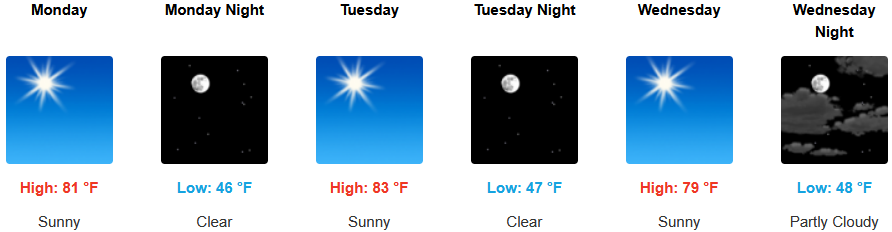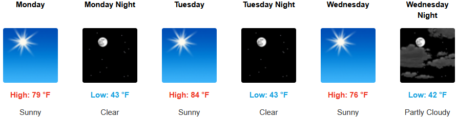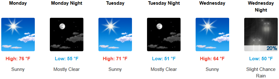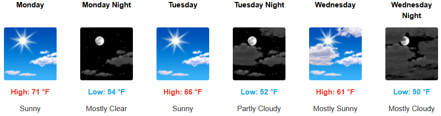 Coastal areas are expected to see mostly clear skies under a morning marine layer burning off by early afternoon along the immediate coast into Wednesday. Temperatures are forecast to be in the low 70’s to start for highs in some areas, cooling to the mid 60’s as the work week progresses with morning lows in the upper 40’s to low 50’s.