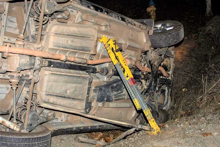 The vehicle was on its side in a 4’ ditch with a person trapped inside. Firefighters first secured the vehicle to keep it from rolling onto its roof or back onto its wheels where the firefighters would be working.