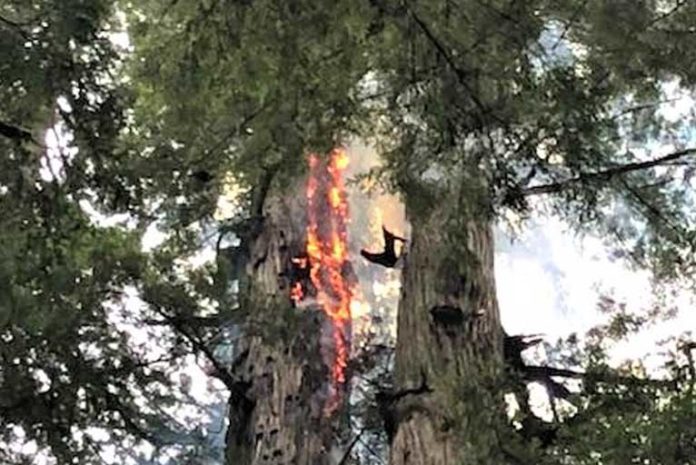 A large Redwood inside Jedediah Smith Redwoods State Park was burning amongst the treetops and no official reason for its ignition has been given by authorities, however, it is believed to be from recent lightning strikes.