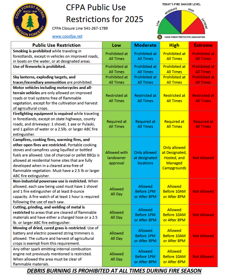 The start of fire season means the end of unregulated, outside burning for rural Coos, Curry and western Douglas Counties. All debris burning will be prohibited until fire season is terminated. For a complete list of all regulations please view the regulated use chart or visit our website.