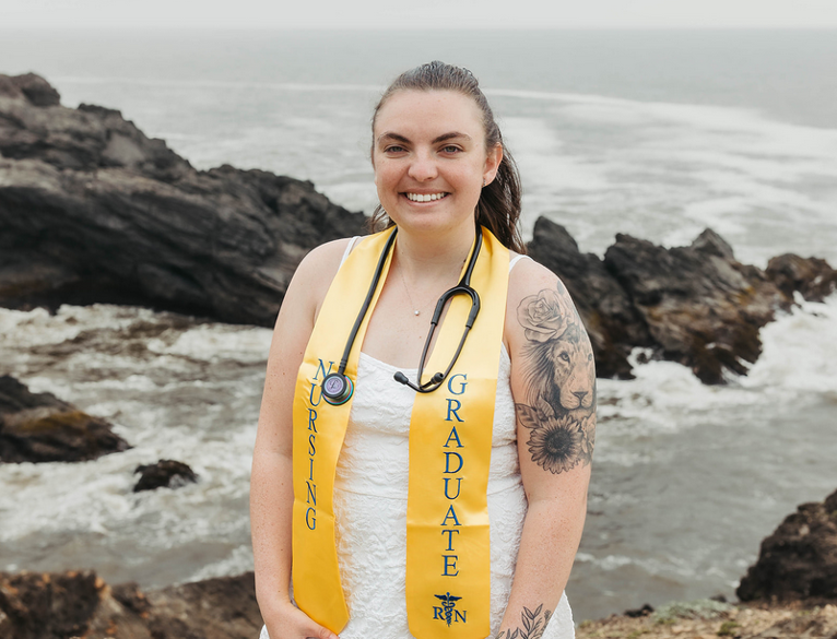 Mia graduated from Brookings-Harbor High School in 2020 and immediately began her prerequisites at Southwestern Oregon Community College. She carried a heavy course load of 12–18 credits per term, and within one year completed all the prerequisites to pursue nursing. Mia didn’t get into the program on her first application and in the fall of 2022, she accepted a position as a Patient Care Technician in the Emergency Department at Curry General Hospital. “The ER environment tested my resilience, sharpened my skills, and reminded me why I wanted to be a nurse in the first place.” she said.