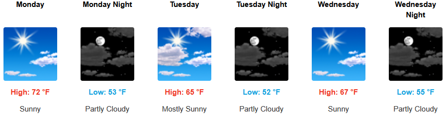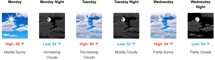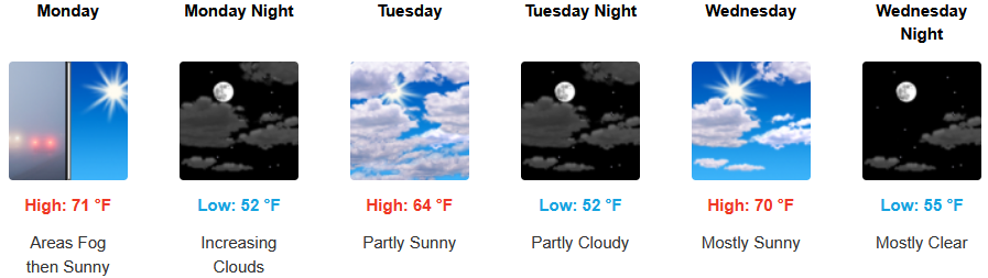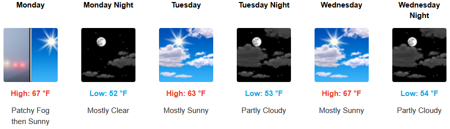 Along the coast a morning marine layer along the immediate coast and localized areas of morning fog are forecast under afternoon sunny skies early in the work week with increasing clouds into mid week before warming again.Temperatures are expected to warm slightly early in the week with temperatures reaching the low 70’s in some areas and morning lows in the low 50’s.