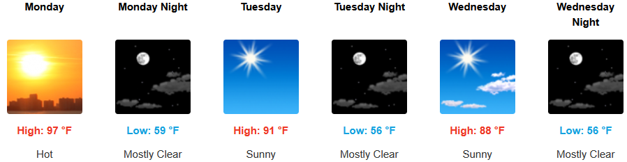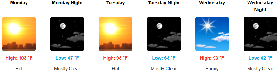 Temperatures are forecast to be warmest inland under clear skies warming 5 to 10 degrees above seasonal averages to start the work week with a variable evening breeze. Temperatures are expected to warm to triple digits early in the week with afternoon highs expected to reach the low 100’s and relatively warm morning lows forecast to be in the low to mid 60’s.