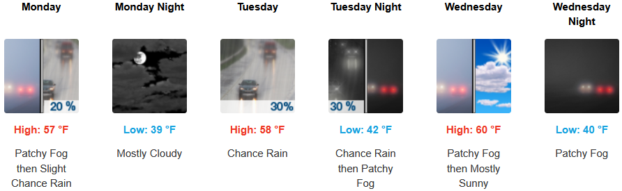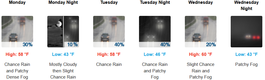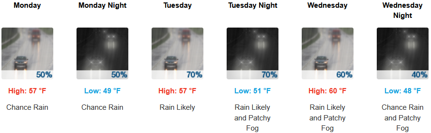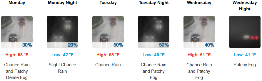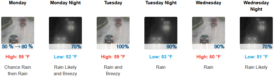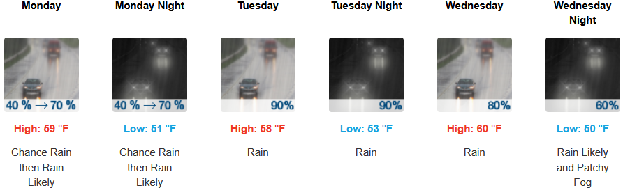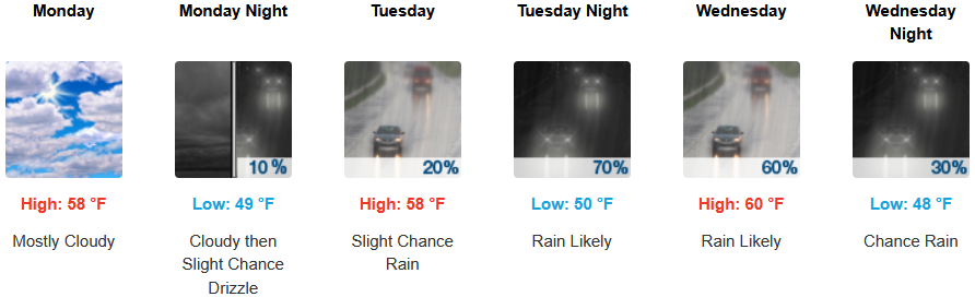 Along the coast, moderate rain is expected to continue through midweek. Temperatures are forecast to be in the mid to upper 50’s to low 60’s for highs, with morning lows in the upper 40’s to low 50’s.