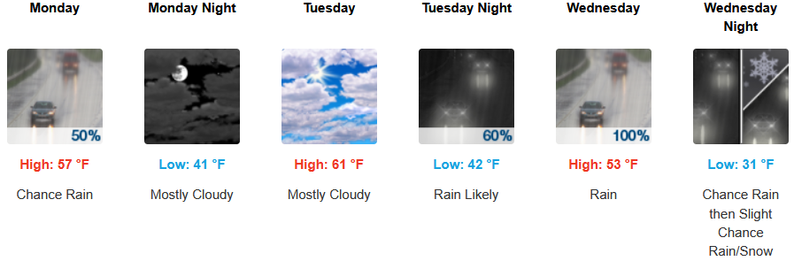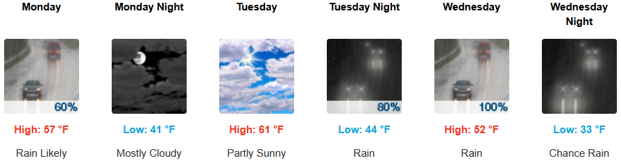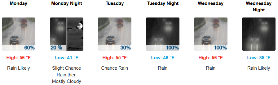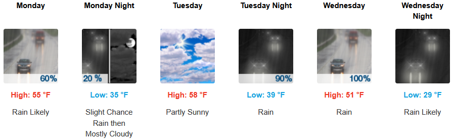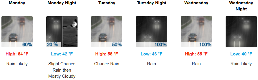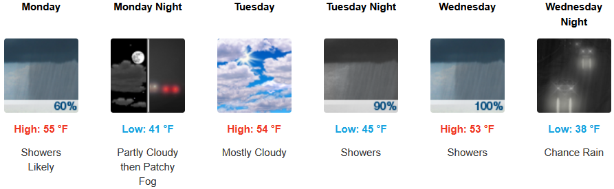 An unsettled airmass is expected for inland areas to start the week with partly cloudy skies, chances of rain, with brief localized downpours and thunderstorms before clouds increase into Tuessday evening with rain forecast into midweek. Afternoon highs will end the week in the mid to upper 50’s, with lows forecast to be in the low to mid 40’s.