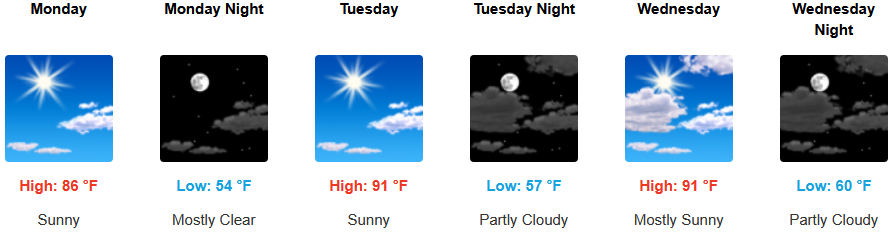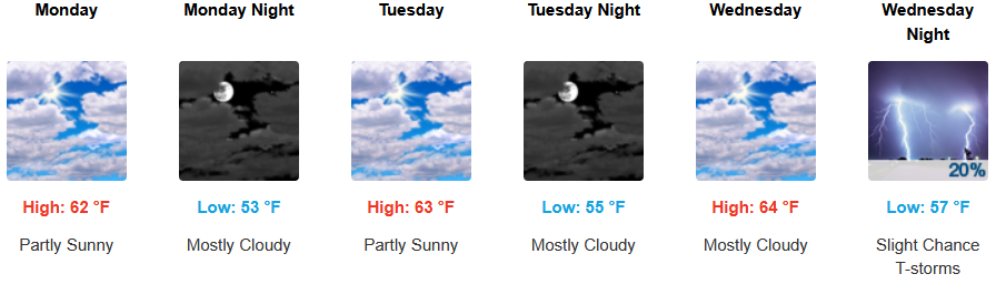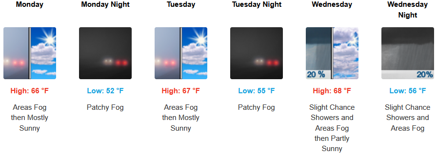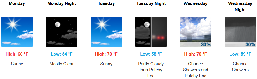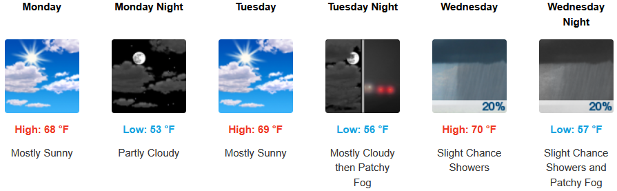 Coastal areas can expect to see more of the same with a continued morning marine layer along the immediate coast and localized areas of morning fog under mostly sunny afternoon skies through midweek. Temperatures are expected to reach the low 70’s for highs in some areas with morning lows in the low 50’s.