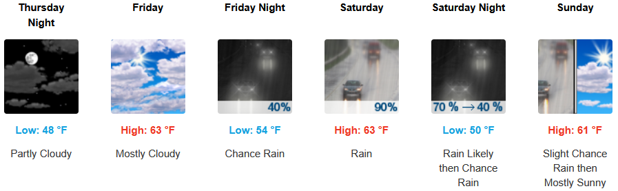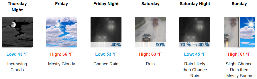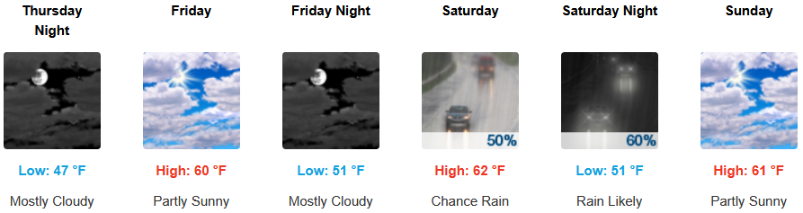 Along the coast, partly skies turn to mostly cloudy skies going into the weekend with chances of rain possibly beginning Friday evening and into the weekend. Temperatures are forecast to be in the low 60’s for highs, with morning lows in the upper 40’s.