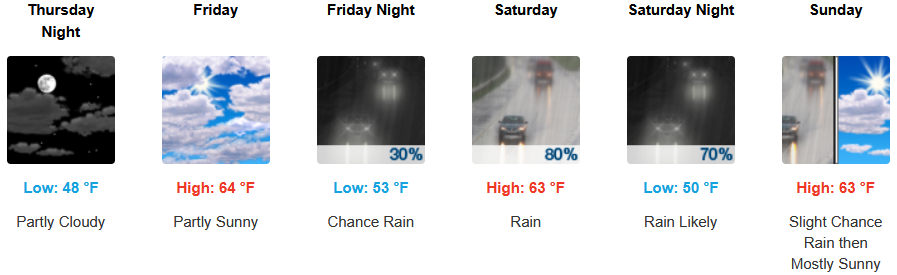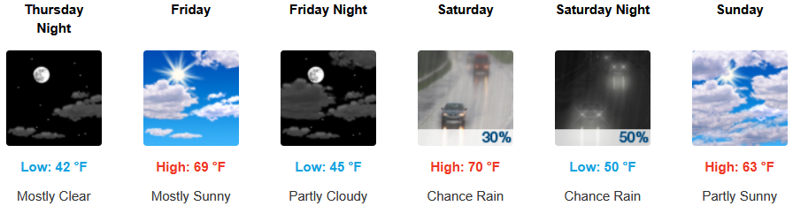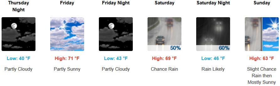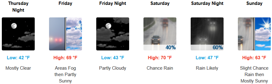 Inland areas are expected to see early morning fog in some areas under partly cloudy skies into the weekend with chances of rain starting early Saturday through Sunday. Afternoon highs are expected to be in the low 70’s, with lows forecast to be in mid 40’s.