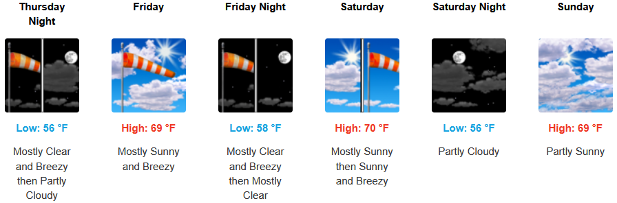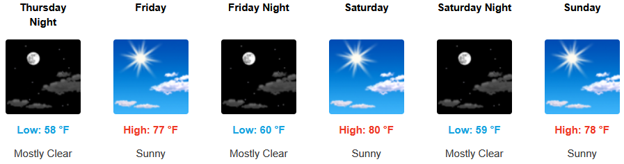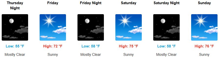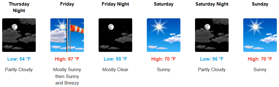 Along the coast a morning marine layer along the immediate coast and localized areas of morning fog are forecast under afternoon sunny skies to end the work week. Temperatures are expected to warm into the week end with temperatures reaching the low 80’s in some areas and morning lows in the low 50’s.