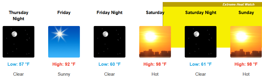 Temperatures are forecast to be warmest inland under clear skies warming 5 to 10 degrees above seasonal averages to finish the work week with Extreme Heat Watches issued for inland areas. Temperatures are expected to warm to triple digits with afternoon highs expected to reach the low 100’s and relatively warm morning lows forecast to be in the low to mid to upper 60’s.