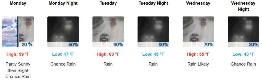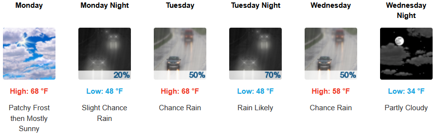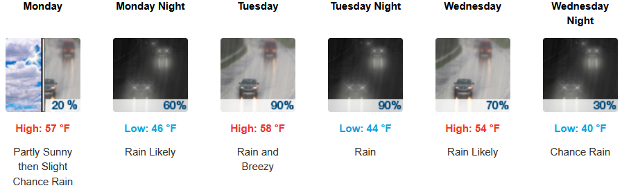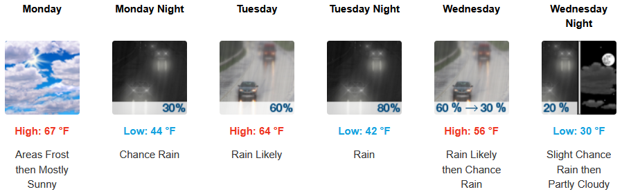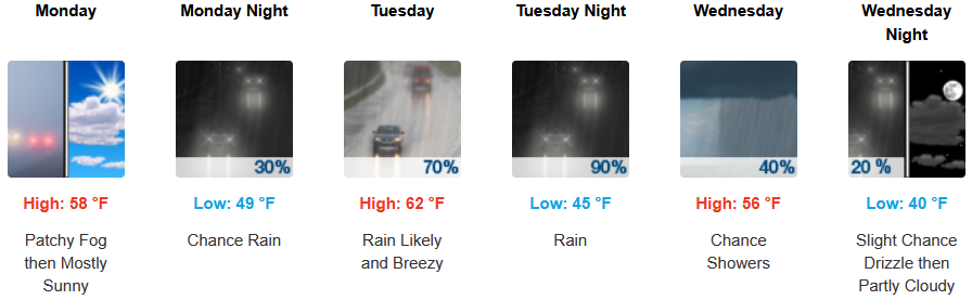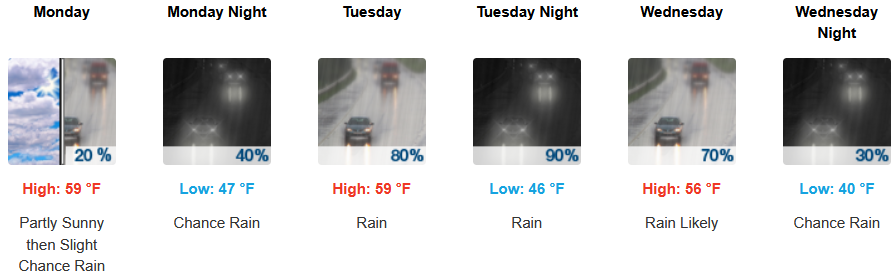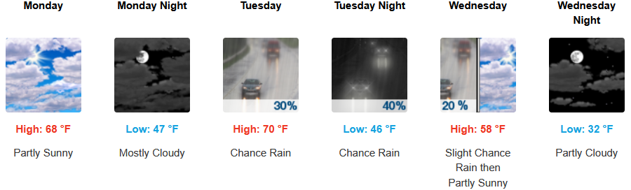 Inland areas are forecast to see cool morning temperatures and partly cloudy skies to start the week before increasing clouds bring the possibility of showers as early as Monday evening, continuing into midweek. Afternoon highs will start the week in the mid to upper 60’s, with lows forecast to be in the mid to upper 40’s.
