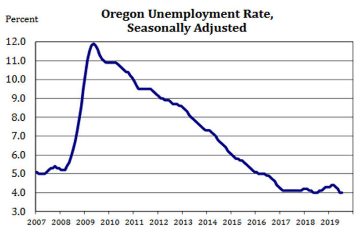 In July 2019, Oregon’s unemployment rate was 4.0%, the same as the revised June rate of 4.0%. This was Oregon’s lowest unemployment rate dating back to 1976. It tied the 4.0% unemployment rate reached in the state in May, June, and July 2018. The U.S. unemployment rate was 3.7% in both June and July 2019.