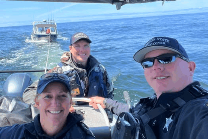 The Oregon State Police Marine Fisheries Team was there to assist, towing the vessel approximately three miles while working closely with the U.S. Coast Guard Station Yaquina Bay to ensure a safe return for everyone on board.