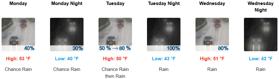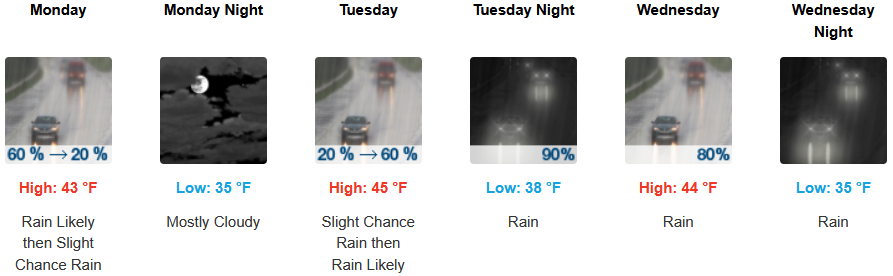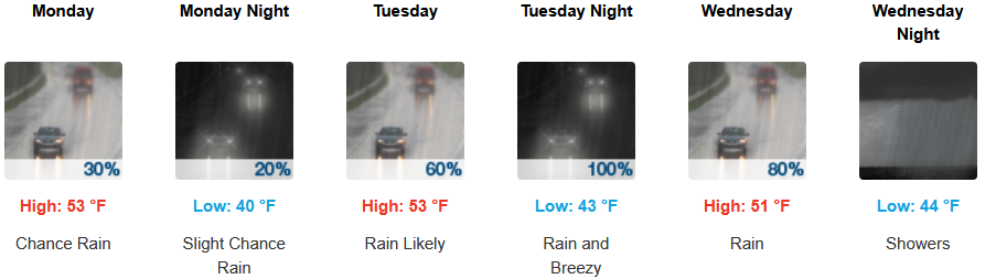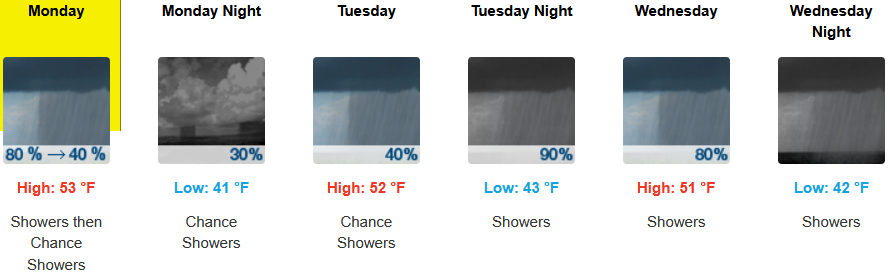Along the coast, rain is forecast to steadily continue with precipitation forecast everyday through midweek. Temperatures are forecast to be in the low 50’s for highs, with morning lows in the low 40’s.