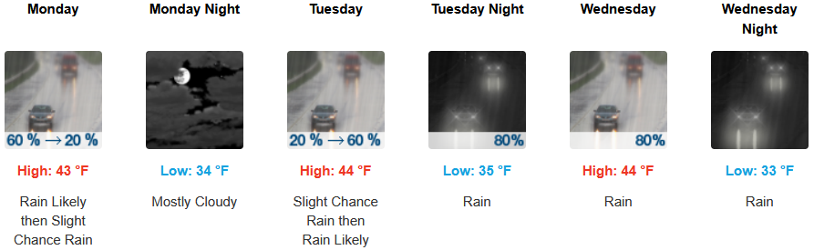 Rain and cooler temperatures are forecast for inland areas through midweek with snow levels starting at 3300′ to start the work week, but rising by midweek. Afternoon highs start in the low 50’s before falling to the mid to upper 40’s, with lows forecast to be in the low 30’s.