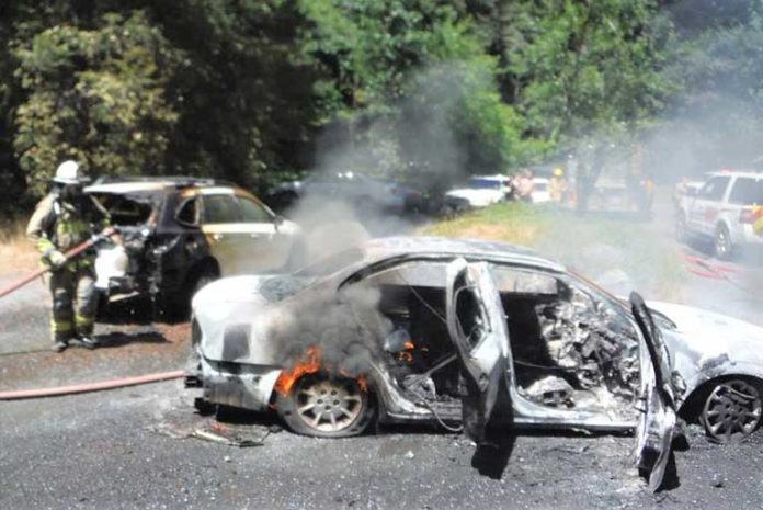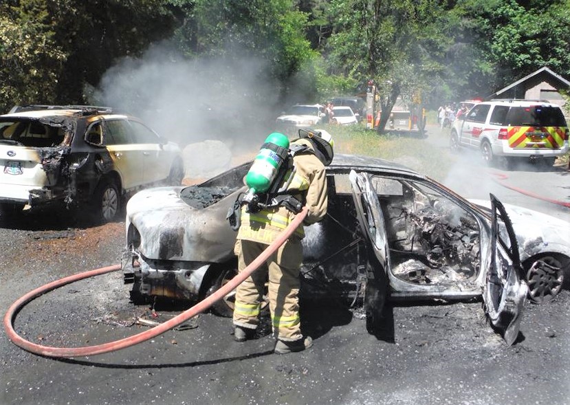 The location is in a remote area on the Illinois River Road. Access for fire apparatus was very difficult as vehicles were parked on both sides of the road at numerous locations. By the time we arrived, the fire extended to a second vehicle and started a small grass fire.