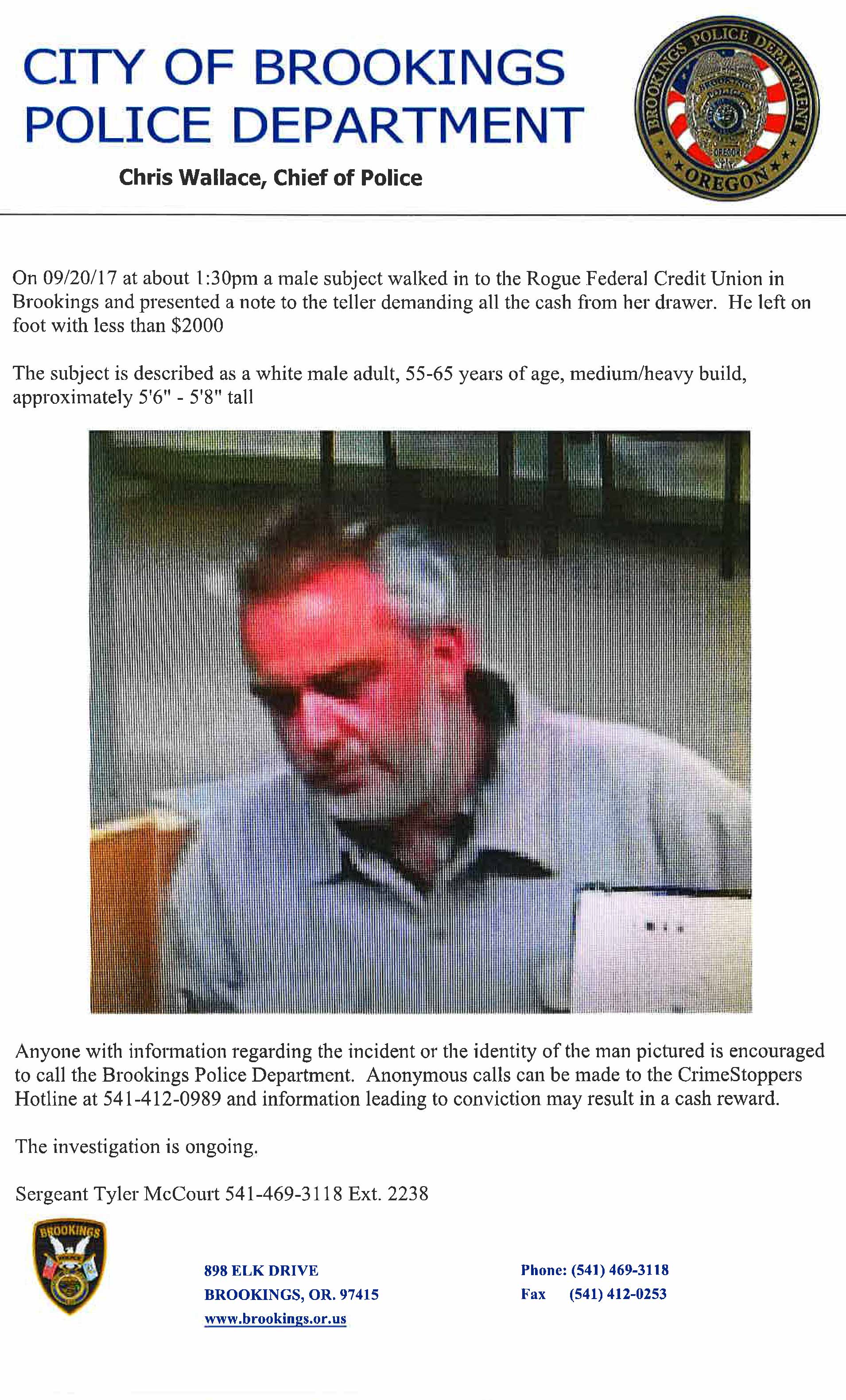According to a press release from the Brookings Police officials are searching for a male suspect who robbed the Rogue Federal Credit Union branch in Brookings Wednesday afternoon.