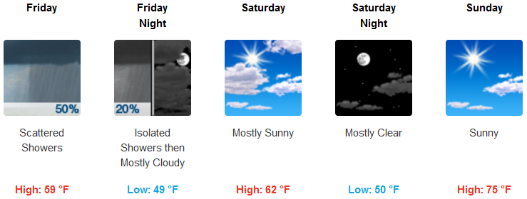 A 50% chance of isolated showers and mild temperatures are expected Friday as we enter the Memorial Day weekend. Partly cloudy skies and warmer temperatures will follow later in the holiday weekend.