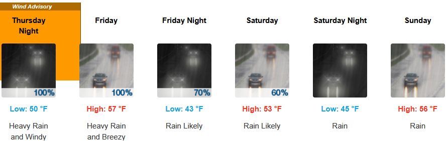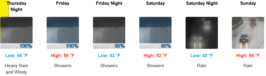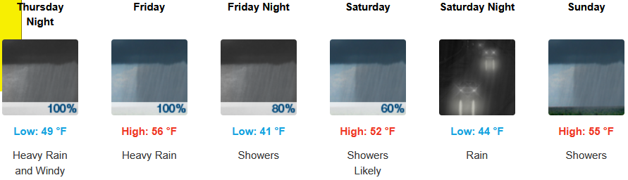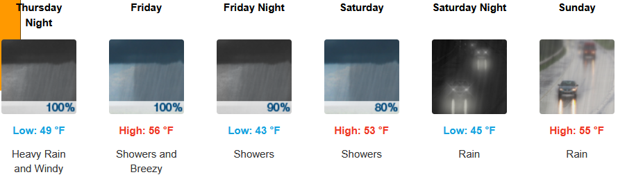 Along the coast, rain, heavy at times, is expected late Wednesday through the weekend, with wind gusting from to 31mph as another cooler weather system moves into the area later in the week. Temperatures are forecast to be in the mid 50’s for highs, with morning lows in the mid to upper 40’s.