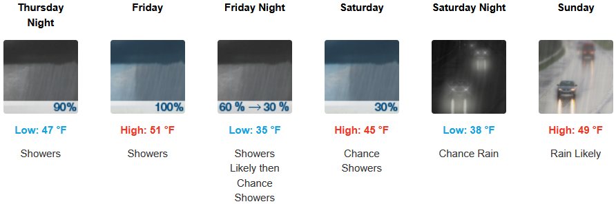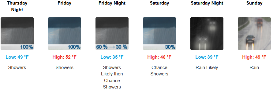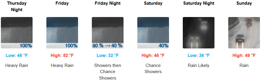 After a short break Wednesday, rain is forecast to return to inland areas as early as early Thursday morning with winds up to 12mph continuing through the weekend with high snow levels falling to the 3100 to 3900ft as cooler air moves in over the weekend. Afternoon highs should be in the upper 40’s to mid 50’s, with lows forecast to be in the low 40’s to upper 30’s.