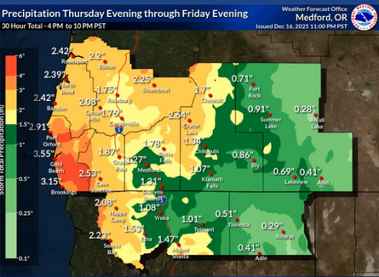 The National Weather Service has issued a High Wind Warning and a Storm Warning into the weekend as a strong ‘atmospheric river’ is expected to impact the Oregon and northern California coasts with moderate to heavy rainfall forecast to impact Coos, Curry, Douglas and Josephine Counties into the weekend.