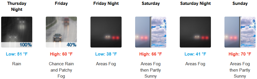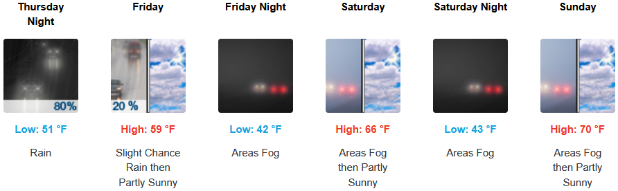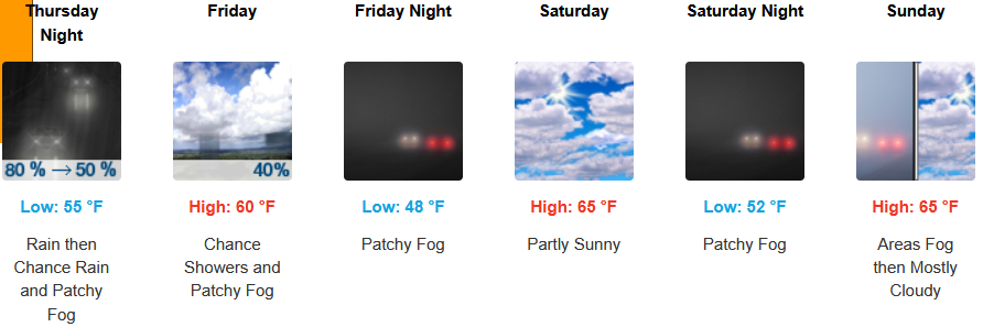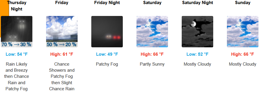 Along the coast, moderate to heavy rain with possible thunderstorms and a south wind gusting to 30mph is expected to continue into the weekend before a colder front moves into the area Friday bringing cooler temperatures and localized fog under partly cloudy afternoon skies. Temperatures are forecast to be in the upper 50’s to the low to mid 60’s for highs, with morning lows in the mid to upper 40’s.