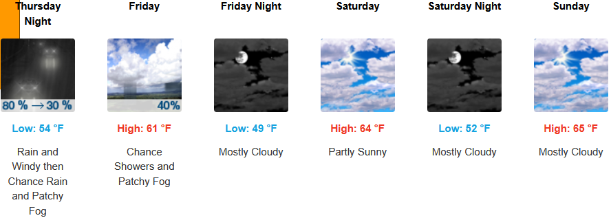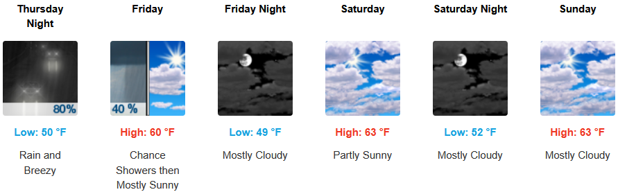 Rain and possible thunderstorms are forecast to close the workweek for Inland areas before partly cloudy skies return Saturday and continue through the weekend. Afternoon highs are expected to be in the upper 50’s before warming to the upper 60’s over the weekend, with lows forecast to be in the low 50’s falling to the low 40’s over the weekend.