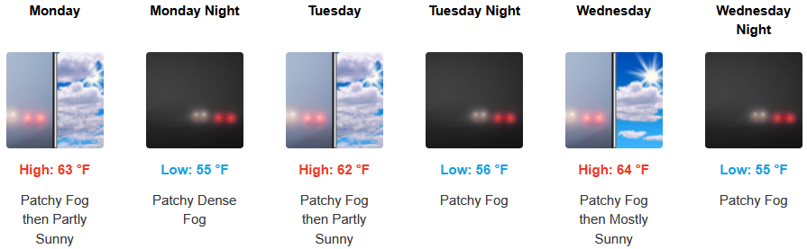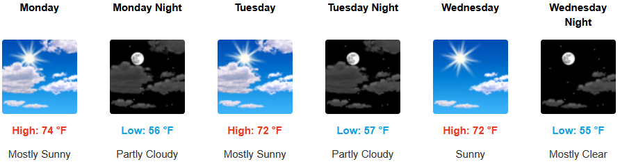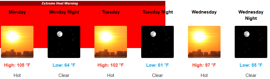 Inland areas are forecast to see continue seeing clear skies and Extreme Heat Warnings through midweek. Afternoon highs are expected to continue to mid to high triple digits to start the work week with little relief overnight with lows forecast in the low to mid 70’s.
