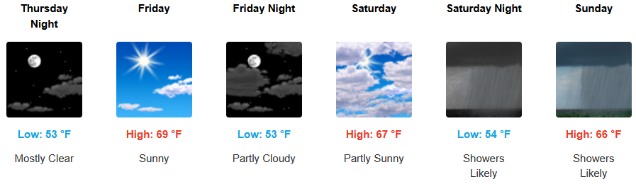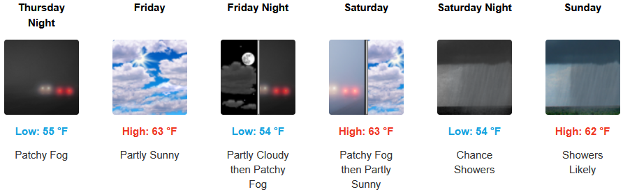 Along the coast, unsettled weather is forecast to close out the workweek with a short break going into the weekend. Localized areas of fog and the usual marine layer along the immediate coast are expected to continue into the weekend with the possibility of showers late in the weekend. Temperatures are expected to stay in the mid 60’s for highs in most areas with morning lows in the mid 50’s.