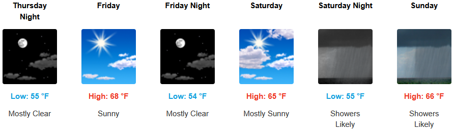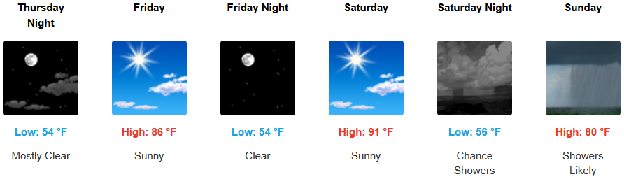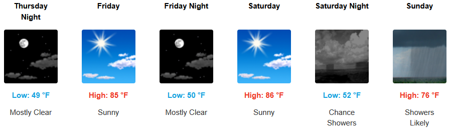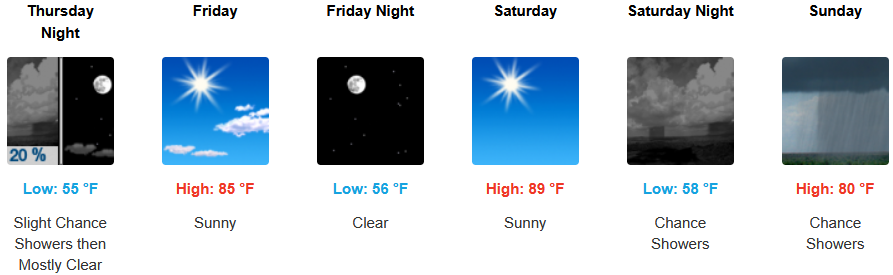 Inland areas can expect a mixed bag through the weekend with a short break going into the weekend before chances of showers move in to end the weekend. Temperatures are expected to remain relatively warm with afternoon highs are expected to range from the mid to high 80’s across the region, with lows forecast to be in the mid 50’s.