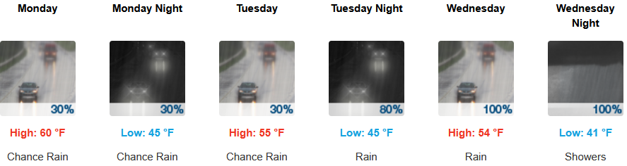 Along the coast, mostly cloudy skies cool mornings and mild afternoon temperatures continue into the workweek with chances of rain beginning as early as Monday morning. Highs are expected to be in the mid to upper 50’s, with lows forecast to be in the low to mid 40’s.
