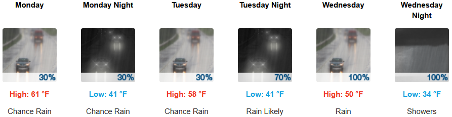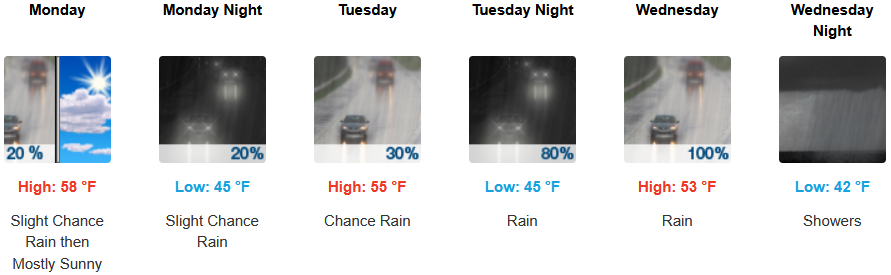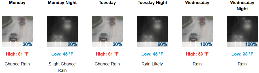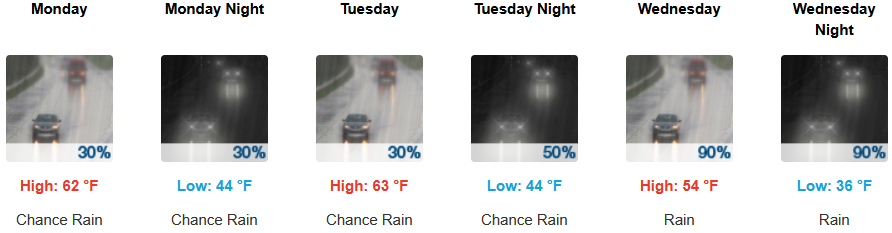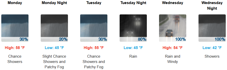 Inland areas can expect cool morning temperatures under mostly cloudy skies a calm northwest wind with chances of rain expected everyday moving into midweek and snow levels rising to above 5,000′. Afternoon highs will start the week in the low 60’s, with lows forecast to be in the low 40’s.
