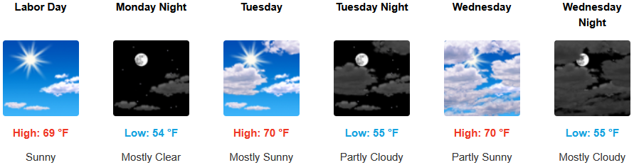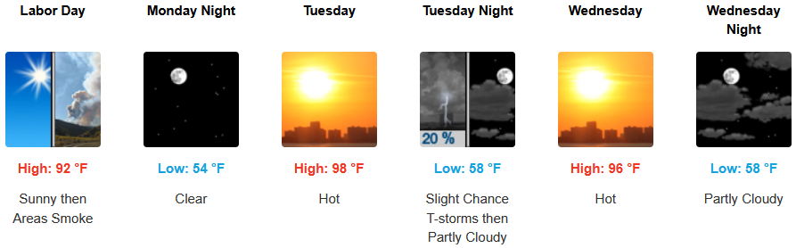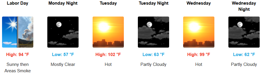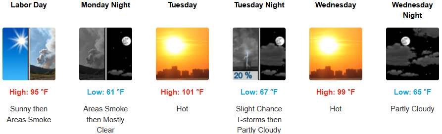 Mostly sunny skies are expected to continue with triple digit temperatures back in the forecast for the workweek. A chance of thunderstorms late Tuesday into Wednesday with afternoon highs expected to climb to the low 100’s in some areas into midweek, with lows forecast in the mid to upper 60’s.