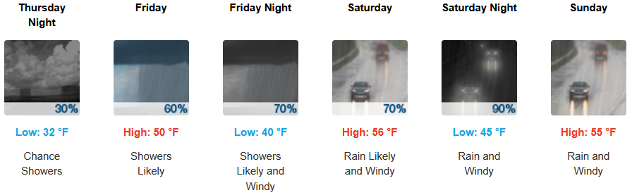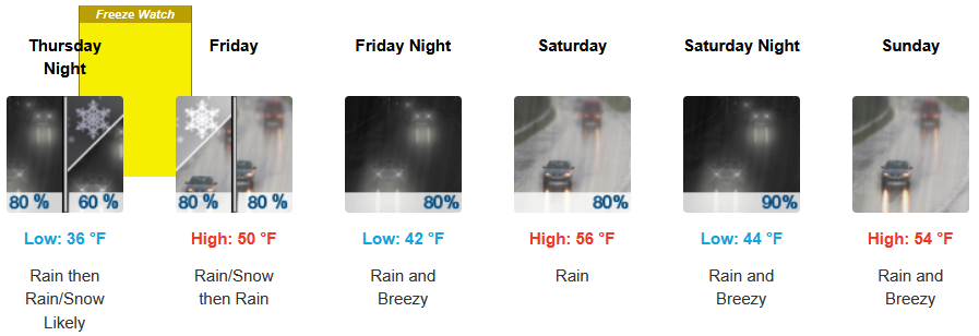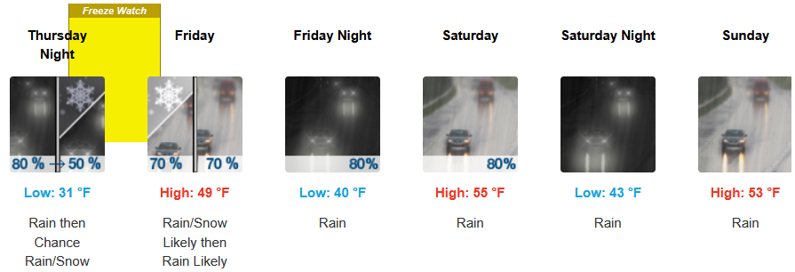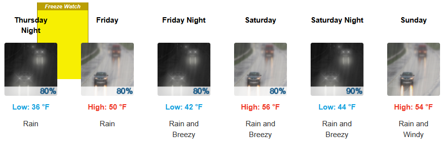 Along the coast, the National Weather Service has issued a Freeze Warning along the immediate coast Thursday into Friday morning with continued widespread rain expected to continue through the weekend and chances of snow Thursday into Friday morning. Temperatures are forecast to end the week in the upper 40’s before slightly warming to the mid 50’s for high’s as the week progresses, with morning lows starting in the low 30’s before rising to the low 50’s into weekend.