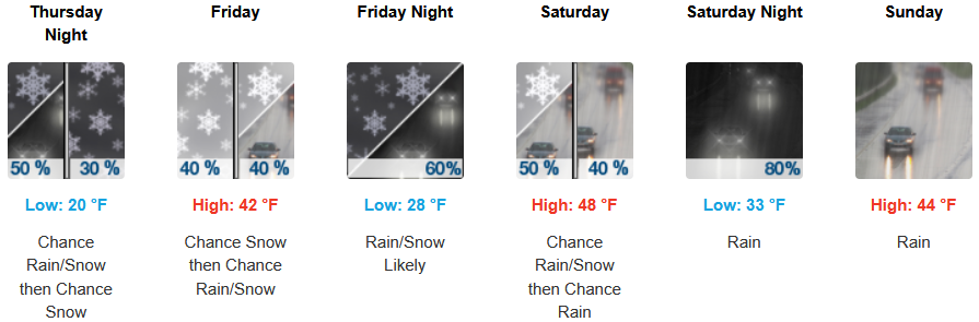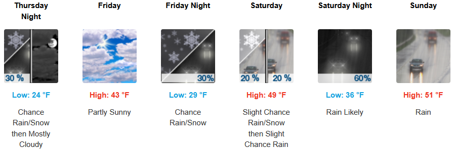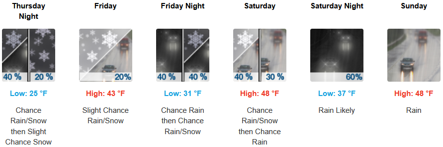 The Winter Storm Warnings issued by the National Weather Service for inland areas now continue into the weekend with rain, snow and cold temperatures continuing as another round of widespread snowfall is expected into Thursday morning, including the valley floors west of the Cascades. Afternoon highs are expected to end the work week in the low to mid to low 40’s, warming slightly into the weekend, with lows forecast to be in the upper 20’s to mid 30’s over the weekend.