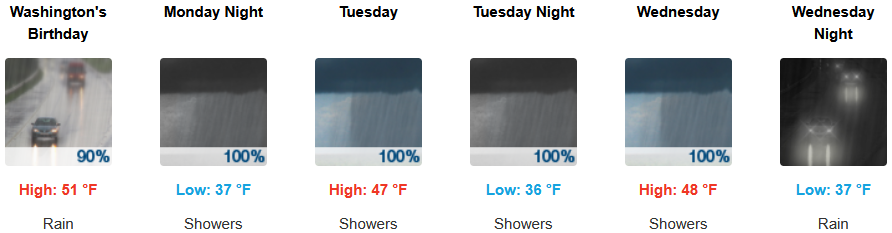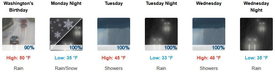 Along the coast, widespread rain is expected to continue to start the work week with chances of snow starting Monday evening. Temperatures are forecast to start the week in the mid 50’s, dropping to the mid 40’s as the week progresses for afternoon highs, with morning lows starting in the low 40’s before dropping to the low 30’s by mid week.